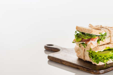 selective focus of fresh green sandwiches with avocado and meat on wooden cutting board on white surface