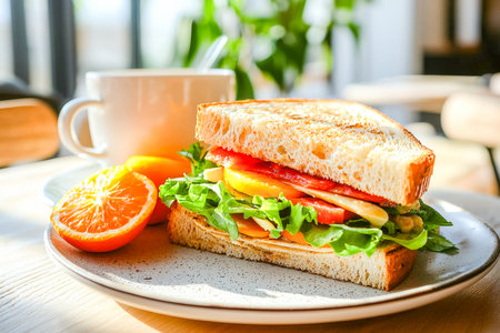 A hearty sandwich loaded with crisp vegetables and melted cheese, complemented by a bright orange and steaming coffee, all artfully arranged on a whit