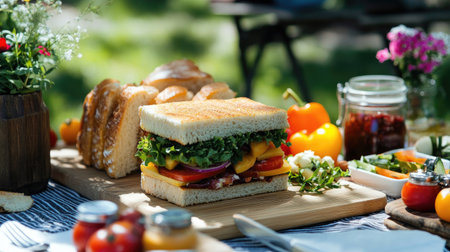 A beautifully styled picnic spread featuring sandwiches made with square bread, colorful fresh vegetables, and condiments, showcasing a delightful outdoor dining experience.