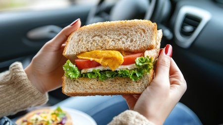 Woman eating a homemade sandwich with a small salad on the seat beside her, a natural everyday scene in the car.