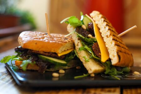 Close up of gourmet grilled cheese sandwich, yummy, tasty appetizing food