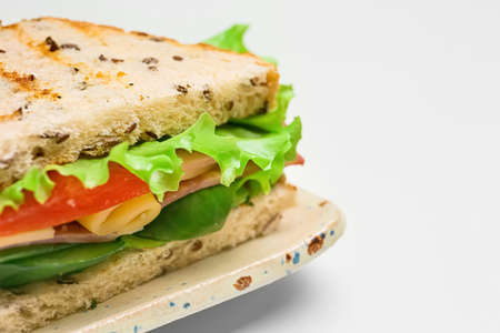 Tall club sandwich with bacon, turkey, cheese, lettuce and tomatoes. Closeup view