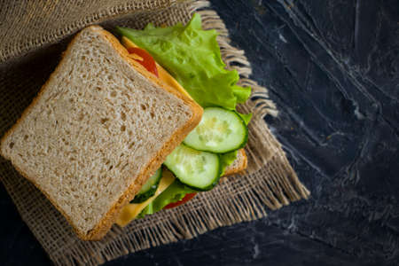 Vegan sandwich with salad and cheese, ondark stone background, copy space