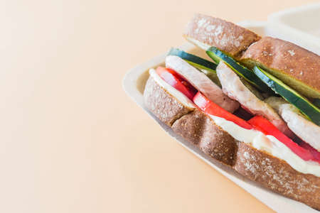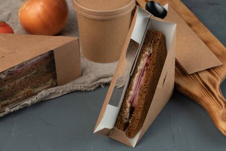Soup and sandwiches in eco packaging - with fresh vegetables, tuna, lean vegetable ham. Vegan food.