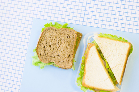 Tasty whole grain sandwich on a blue kitchen table, healthy eating cocnept