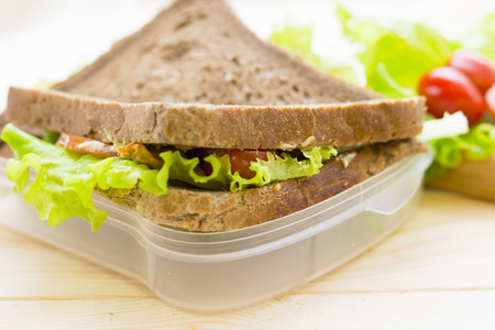 Healthy Lunch Concept. Rye bread sandwich with vegetables in a box, light wooden background, close up