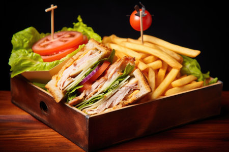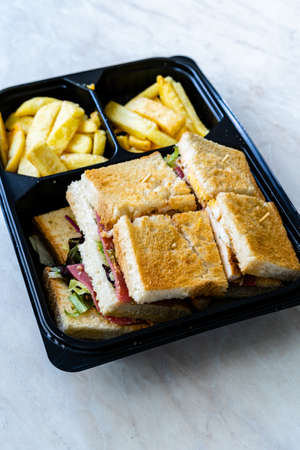 Take Away Club Sandwich with Potatoes Fast Food Menu in Plastic Container / Table d'hote. Ready to Serve and Eat.