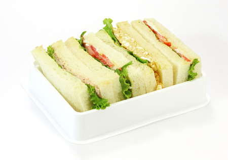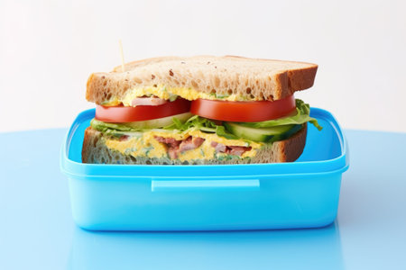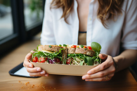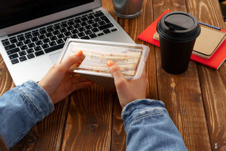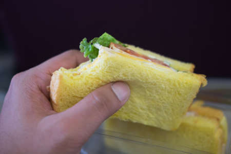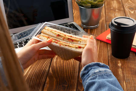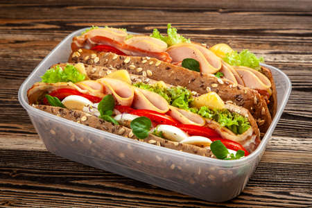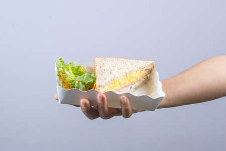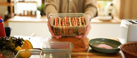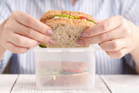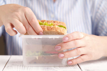 hand of woman holding sandwich with filling in a plastic box in the morning.