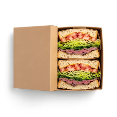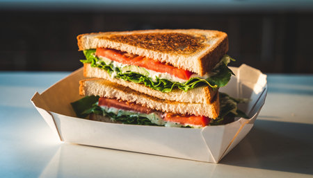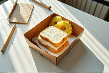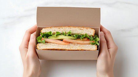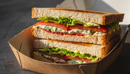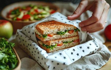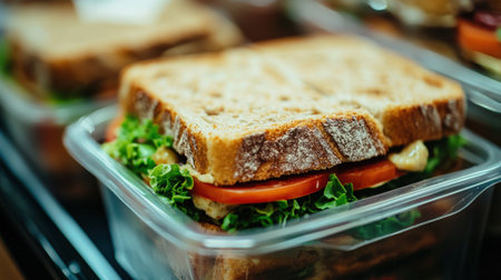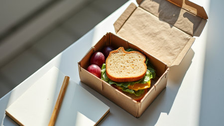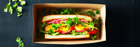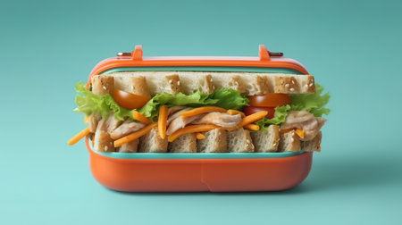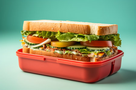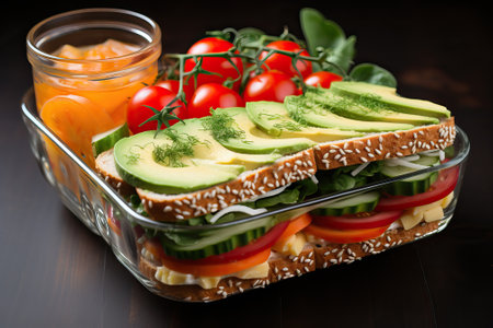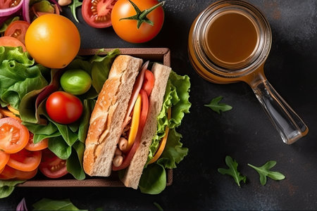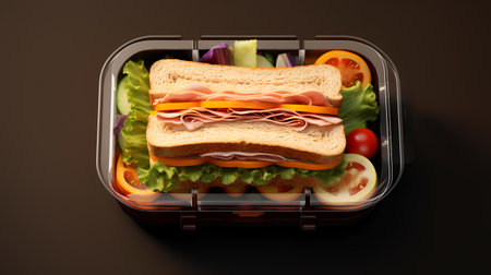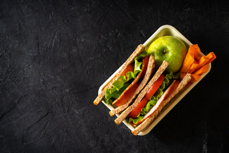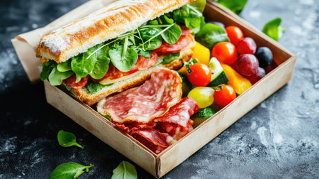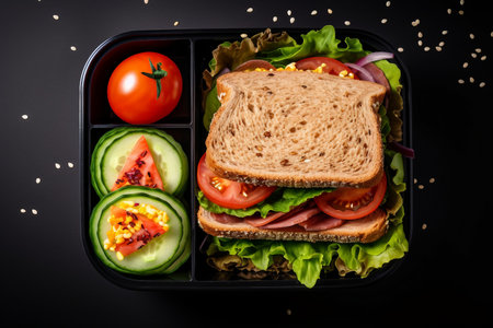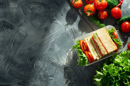 Nutritious lunch box on stone table with sandwich, fresh vegetables, ample space for text
