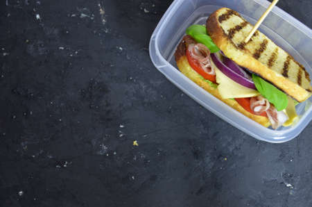 Sandwich toast with fresh salad, tomato, bacon in lunch box on black background, copy space