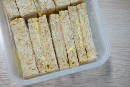 Triangle slice piece of sandwich ham cheese in box on wood table
