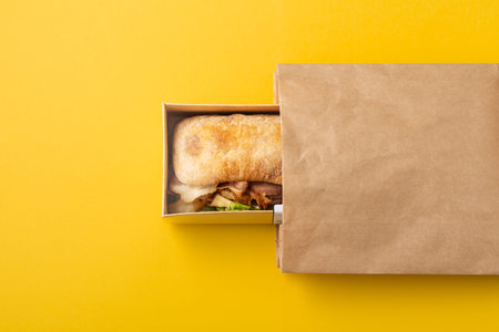 Sandwich in takeout or delivery food container and paper bag on yellow background, top view
