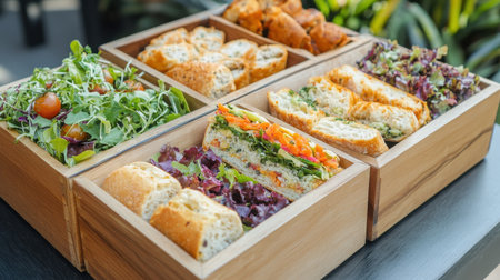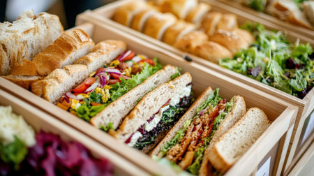 Beautifully decorated catering banquet table with different food snacks and appetizers setting with sandwiches, bagels, baguette club submarine sandwich, on wooden plate, on party or celebration