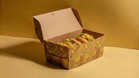 Sandwich with cheese, ham and fresh vegetables in a container on a yellow bright background