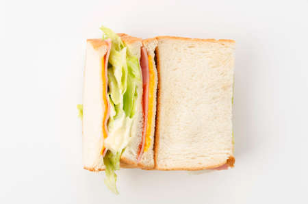 Cheese and ham sandwich wrapped in paper on white background with copy space