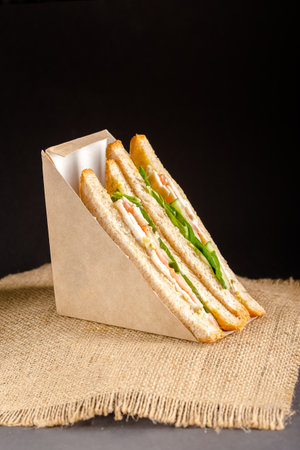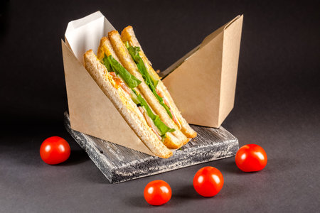 Delicious sandwiches in plastic packaging close-up on a black background. Delicious breakfast in a package.