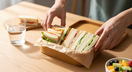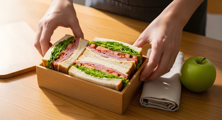 Close up on pair of female hands removing a healthy wholesome wholemeal bread ham sandwich from her lunch box during lunch break