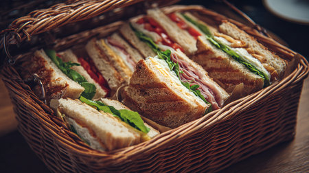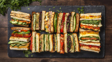 Deliciously stacked sandwich made with whole grain bread and fresh ingredients served on a wooden platter