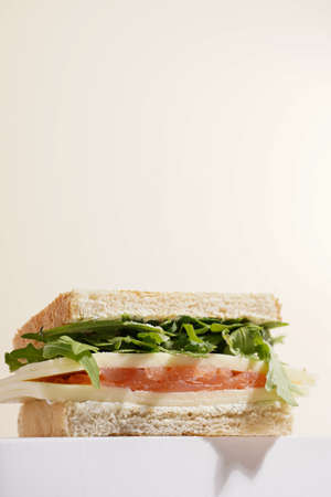 A white toast bread sandwich with salmon, cheese, cream cheese and green rocket. negative space for text