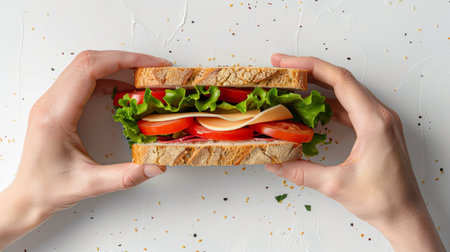 Woman holding a sandwich, showcasing healthy eating habits in a cozy indoor environment with natural light and soft colors