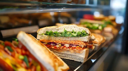 Sandwiches with fresh ciabatta and green salad on a shop window.