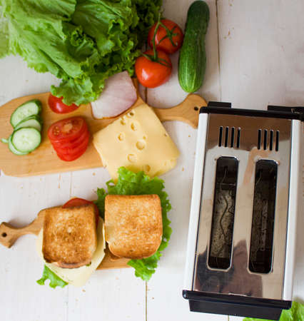 Sandwich with cheese, cucumber, tomato and ham. Put a sandwich on a wooden board. Toaster. View from above. copyspace