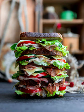 Big sandwich with bread, prosciutto, lettuce, tomtatoes, cucumber and cheese in the kitchen