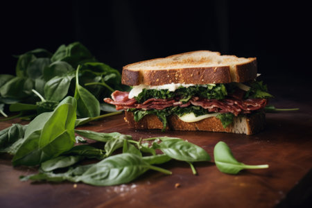 a sandwich surrounded by scattered basil leaves, created with generative ai