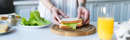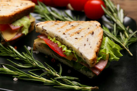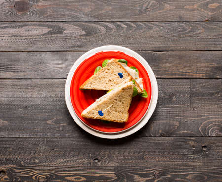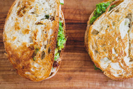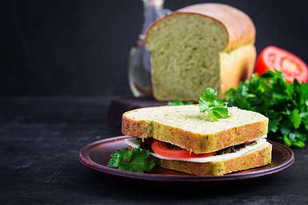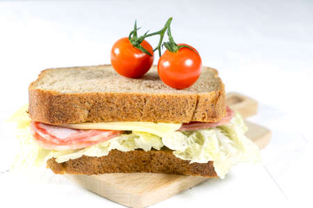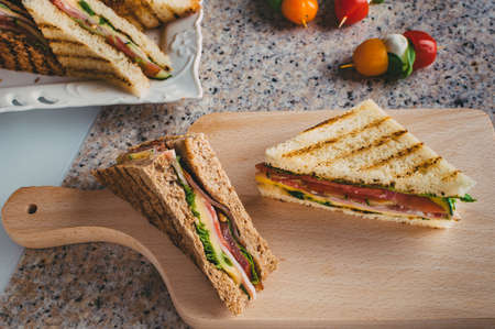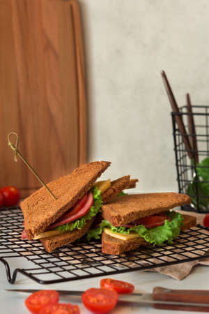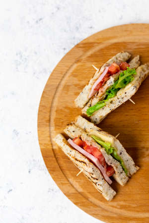 Traditional sandwich made from slices of toasted bread, cheese, ham, fresh lettuce. Celebrating National Sandwich Day.