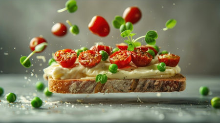 Gourmet bruschetta with fresh tomatoes and cheese mid-air, a culinary delight. Download this flavorful AI generated masterpiece