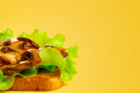 Bread toast with green leaves, salads, fried mushrooms and white sauce on a yellow background. copy space