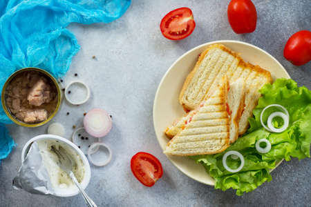 Double sandwich with canned tuna and feta cheese served with lettuce leaves on a background of gray stone. Top view with copy space.