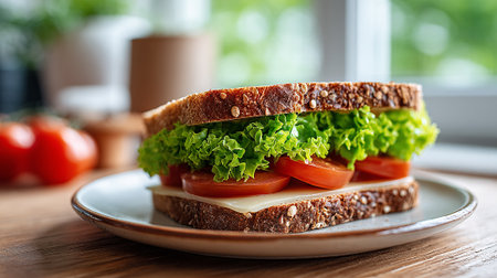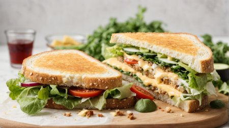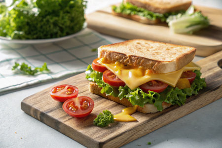 A sandwich is assembled with layers of lettuce, tomato, cheese, and golden bread. Fresh greens and tomato slices add vibrant color, enhancing the meals appeal.