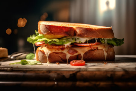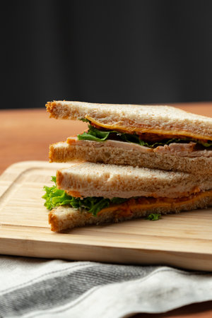 Delicious layered sandwich with lettuce and cheese served on a wooden board in a cozy setting