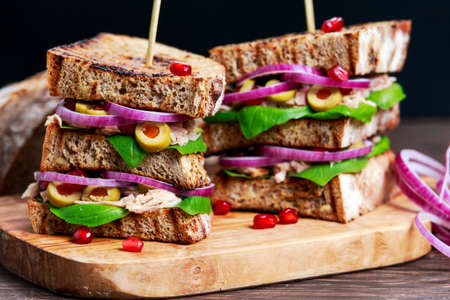 Grilled Tuna Sandwich on plate with onion, olives and pomegranate