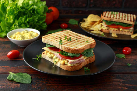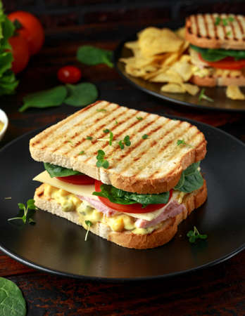 Delicious toast sandwich with ham, cheese, egg and vegetables. Top view.