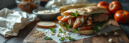 Delicious sandwich with chicken, fresh vegetables, and herbs on a wooden table with tomatoes in the background
