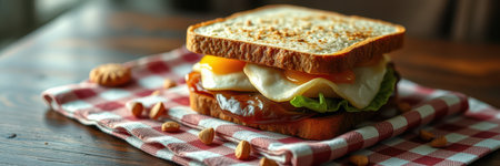 A hearty breakfast mega sandwich features layers of crispy bacon, melted cheese, and fresh greens nestled between wholesome bread. Perfectly crafted for a satisfying morning meal, banner