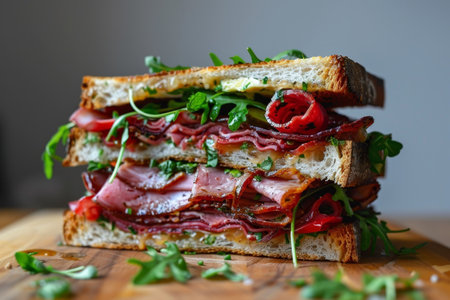 AI Generated. Delicious sandwich with layers of meat cheese and lettuce on a wooden board ready to be served