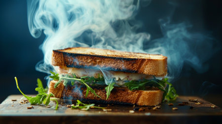 Close-up of a hot grilled sandwich with melted cheese, fresh arugula, and visible steam rising. Delicious and comforting food image with a rustic feel.