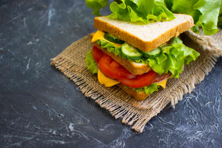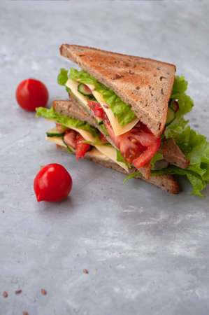 Delicious sandwich with fresh lettuce leaves, tomatoes, cucumbers and cheese on a gray table background.