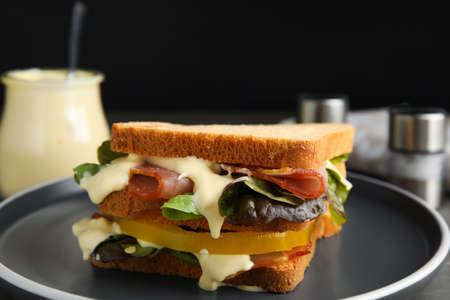 Delicious sandwich with vegetables, ham and mayonnaise plate, closeup