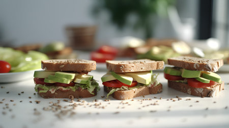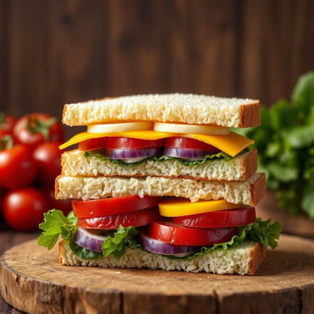 This vibrant vegetable sandwich showcases layers of fresh greens, ripe tomatoes, colorful peppers, and creamy cheese. Perfect for healthy meals.