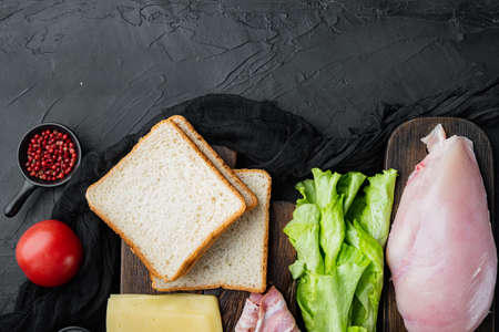 Club sandwich with fresh ingredient, on black background, top view with copy space for text