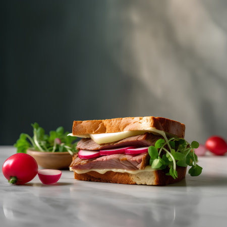 Sandwich with beef, cheese, tomato and lettuce on a marble background