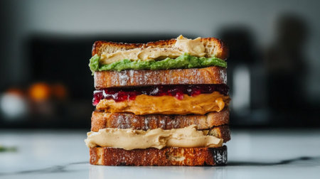 This image features a stack of colorful toast layers, showcasing various spreads like peanut butter, jelly, and avocado. Perfect for snack or meal inspiration.