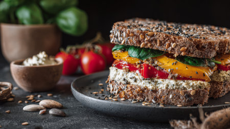 A vibrant vegetable sandwich featuring layers of fresh spinach, yellow and red peppers on whole grain bread, garnished with seeds and served on a dark backdrop.