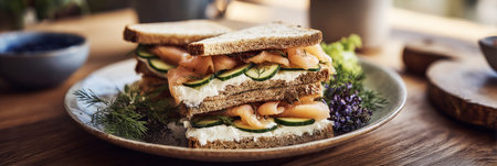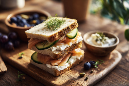 Delicious breakfast meal showcases towering mega sandwiches filled with smoked salmon, crisp cucumber, and rich cream cheese. Enjoyed in a warm cafe with natural light