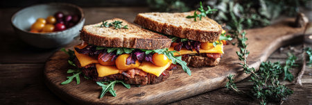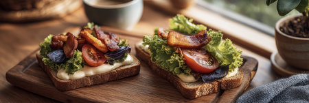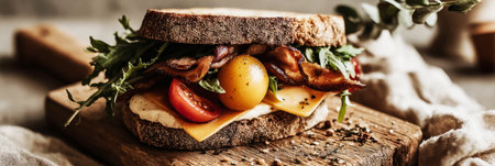 A hearty breakfast sandwich features crispy bacon, cheddar cheese, and fresh greens between two thick slices of whole grain bread, all presented on a rustic wooden board, banner