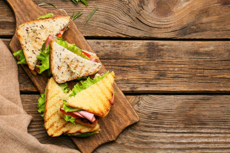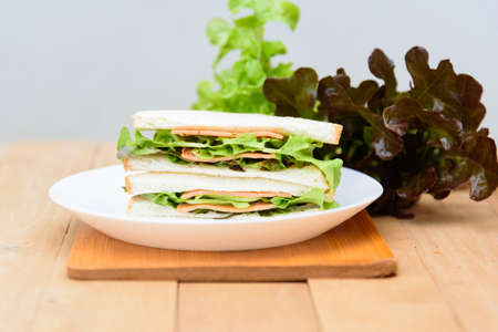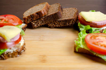 Top view of Healthy Sandwich toast with lettuce, ham, cheese and tomato on a wooden background